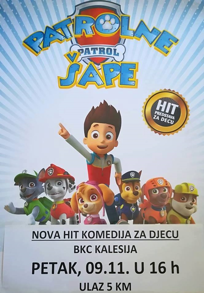 U petak, 9. novembra, u 16,00 sati, u sli kalesijskog BKC-a, odigrat će se pozorišna predstava „Patrolne šape“ u izvođenju Mašinog pozorišta Beograd.