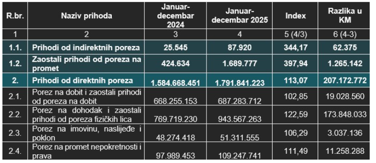 Strukturu javnih prihoda za period januar-decembar 2025. godine u odnosu na januar-decembar 2024. godine prikazuju u sljedećoj tabeli: