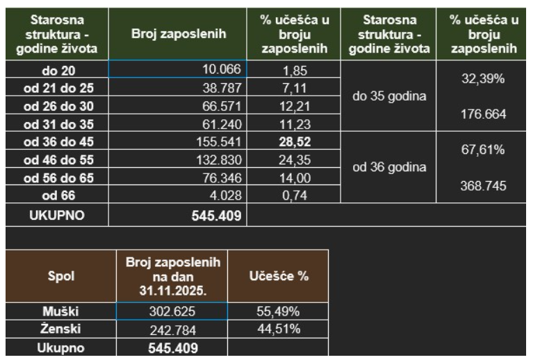 Prema službenim evidencijama Porezne uprave Federacije BiH na dan 31.12.2025. godine do 35 godina života zaposleno je 176.664, ili 32,39 %, a preko 36 godina života zaposleno je 368.745 ili 67,61%.