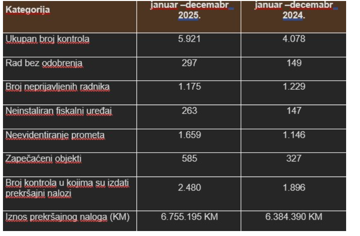 U periodu januar-decembar 2025. godine izvršen je 5.921 inspekcijski nadzor, što je 1.843 kontrole više nego u istom periodu 2024. godine.