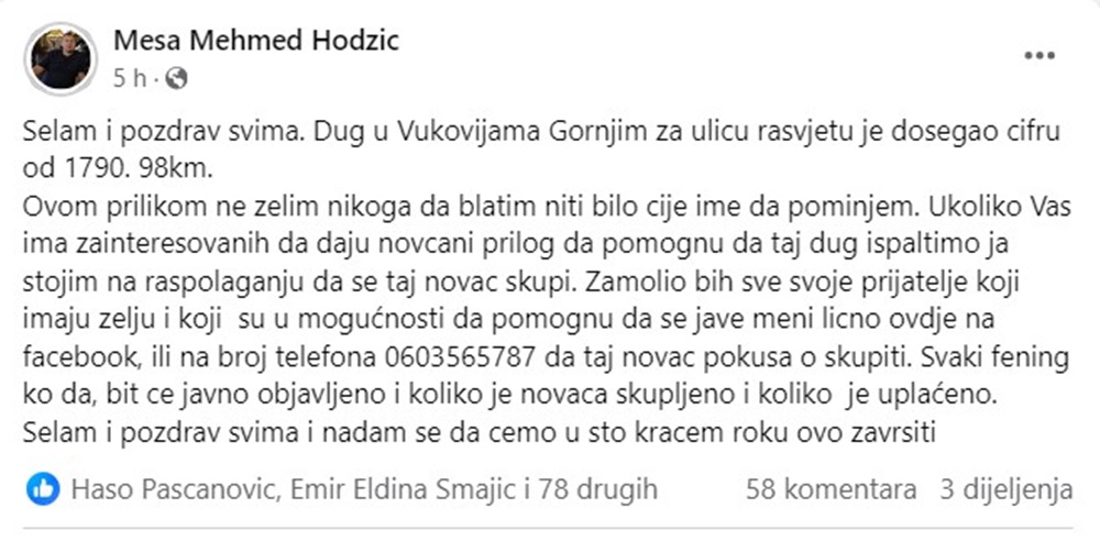 Međutim za veoma kratko vrijeme putem facebooka u akciji koju je pokrenuo Meša Mehmed Hodžić novac je prikupljen i dug će biti uplaćen kako bi ovo naselje i dalje imalo uličnu rasvjetu posebno u ovim mubarek danima.