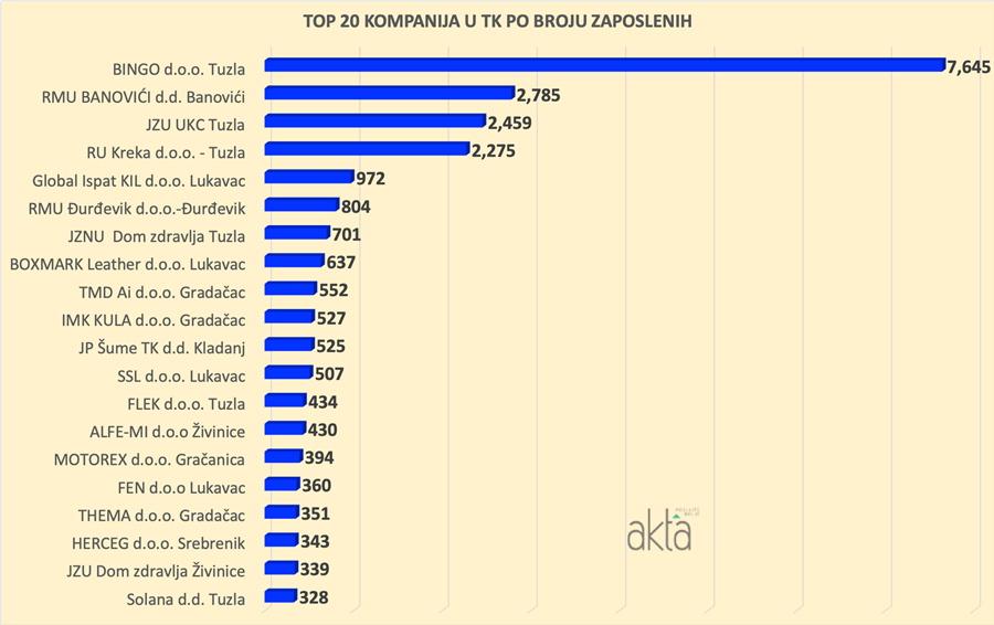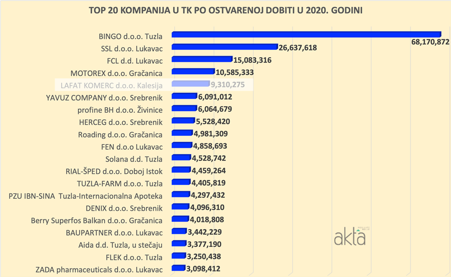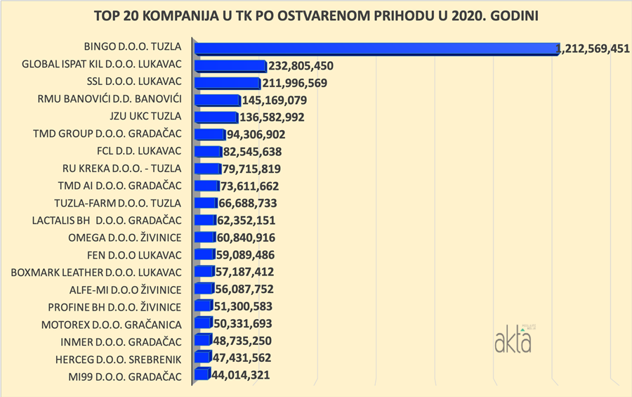 Na listi TOP 20 kompanija nema velikih promjena, te su prvih pet mjesta istim redosljedom zauzele iste kompanije kao i 2019. godine. Sasvim očekujuće lider u svim kategorijama je tuzlanski gigant Bingo.