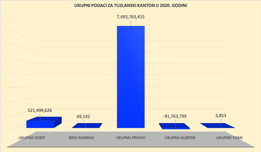 Kompanije u Tuzlanskom kantonu ostvarile su u 2020. godini 7,4 milijardi KM prihoda, što je za oko 400 miliona KM manje u odnosu na 2019. godinu, pokazuje Akta.ba analiza urađena na osnovu finansijskih pokazatelja za prethodnu godinu.