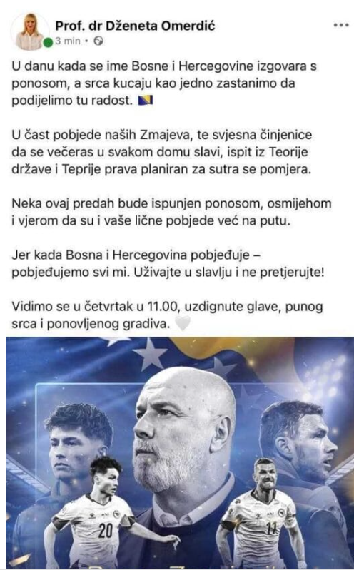 – U ovom sivilu koje nas je obuhvatilo, u moru loših vijesti, napokon imamo nešto veličanstveno i bez ijedne primjedbe. To je ono što treba Bosni i Hercegovini. Pustimo sada podjele — ovo je veliki trenutak i uspjeh svih nas – rekao je Komšić.