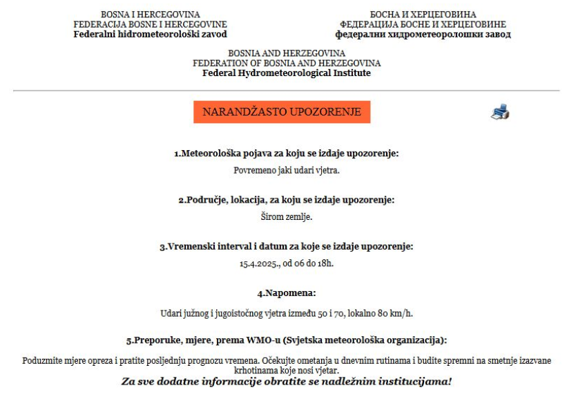 Federalni hidrometeorološki zavod BiH izdao je narandžasto upozorenje za danas, 15. aprila zbog povremeno jakih udara vjetra.