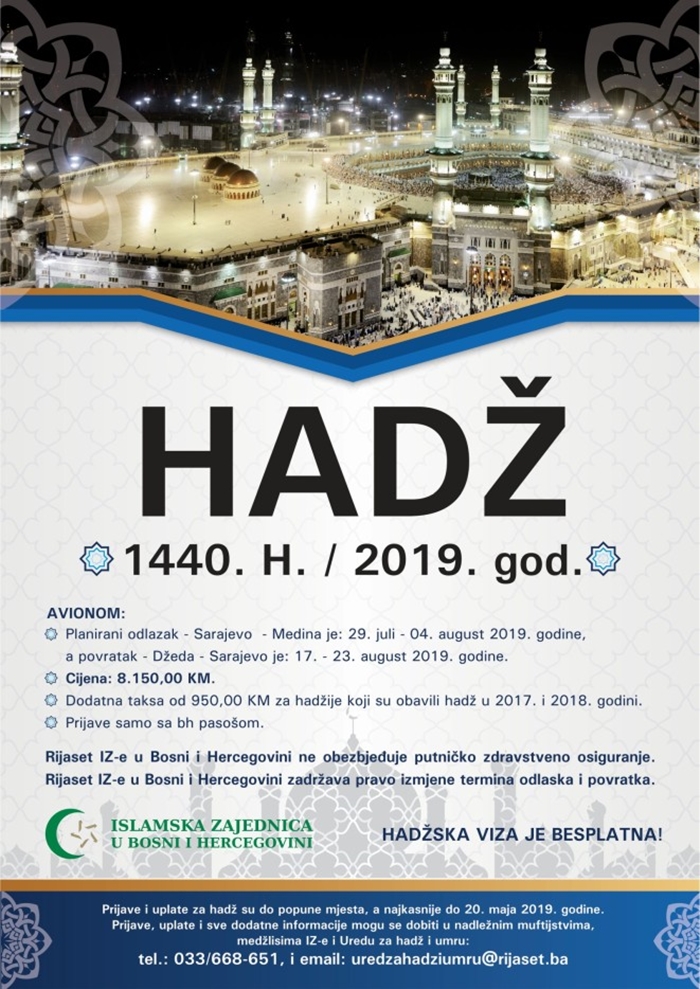 Ured za hadž Rijaseta Islamske zajednice u Bosni i Hercegovini objavio je jučer poziv za prijave za odlazak na hadz 2019. godine.