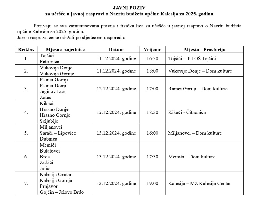 U petak 13.decembra Javna rasprava je planirana u Domu kulture Miljanovci za mještane Miljanovaca, Sarača, Lipovica i Dubnice sa početkom u 16:00 sati, a u 17:30 sati u Domu kulture u Memićima za one iz Memića, Bulatovaca, Brda, Zukića i Jajića, dok će u 19:00 sati biti održana u prostorijama MZ Kalesija Centar za zainteresovane iz Kalesije Centra, Kalesije Gornje, Prnjavora, Jelovog Brda i Gojčina.