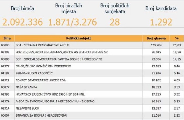 Prema podacima objavlenim nešto iza osam sati, najjača parlamentarna stranka u Federaciji BiH je Stranka demokratske akcije sa osvojenih 25 posto glasova. Za njom slijedi koalicija okupljena oko Hrvatske demokratske zajednice sa 18 posto te Socijaldemokratska partija sa 14 posto osvojenih glasova.