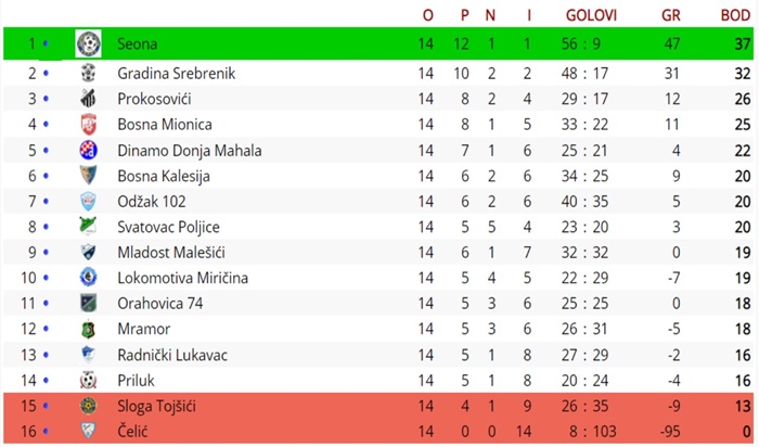Sloga je predposljednja ekipa na tabeli sa 13 osvojenih bodova, dok će Bosna prezimiti na šestoj poziciji sa 20 bodova.