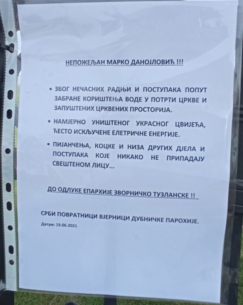 Na kapiji crkve Svetih Joakima i Ane u Dubnici ovih dana osvanule su poruke upućene svešteniku Marku Danojloviću.