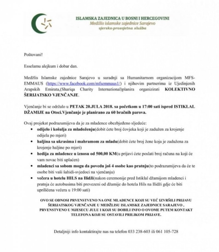 Medžlis Islamske zajednice Sarajevo, u saradnji sa Humanitarnom organizacijom MFS-EMMAUS i njihovim partnerima iz Ujedinjenih Arapskih Emirata, organizira kolektivno šerijatsko vjenčanje u Sarajevu.